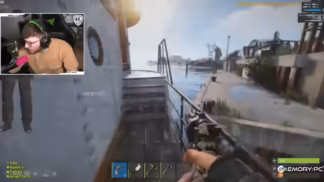 06:59:20Das Team erreicht mit ihrem Boot die Ölplattform und beginnt mit der Durchsuchung. Sie stoßen auf Feinde und es kommt zu einem Feuergefecht. Der Streamer findet die blaue Schlüsselkarte, aber sein Team wird angegriffen und teilweise getötet. Es herrscht Chaos und Verwirrung über die Positionen der Teammitglieder.