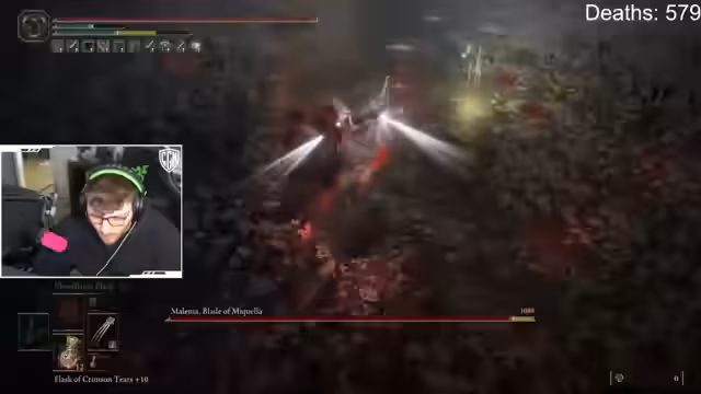 06:04:06Nachdem der Streamer einem Rat des Chats gefolgt ist und sich zurückgezogen hat, wird er dennoch von einem Angriff Malenias getroffen. Er fühlt sich von der Community angelogen und ist am Ende seiner Kraft. Die andauernde Frustration, Hunger und der hohe Zeitaufwand führen dazu, dass er den Kampf abbricht und den Stream für beendet erklärt.