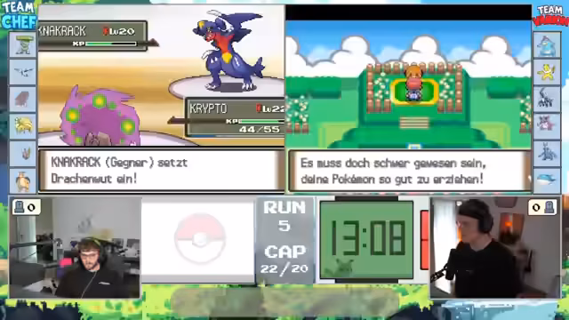 02:52:59Ein Höhepunkt des Streams ist der plötzliche Legendary-Encounter, der sowohl bei Flo als auch bei Chef gleichzeitig auftritt. Beide fangen ein sehr starkes Pokémon und sind begeistert von dem Zufall. Dabei wird über den Namen des Pokémon Cobra diskutiert und dessen Stärke im Team bewertet. Dieser Erfolgsschub hebt die Stimmung deutlich und zeigt den Reiz des zufälligen Nuzlocke-Runs.