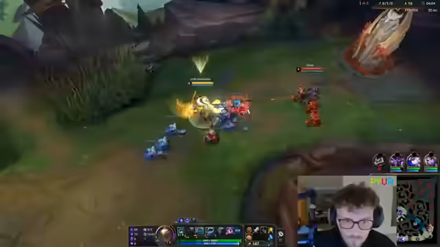 00:22:38Der Streamer spielt League of Legends und zeigt sich frustriert über sein Spiel und seine Mitspieler. Er kritisiert besonders den Jungle-Champion Warwick, der ihm trotz weniger Items viel Schaden zufügt. Er erwähnt mehrfach die schlechte Leistung seines Teams, insbesondere auf der Bot-Lane, und beschwert sich über das Matchmaking-System. Er hat Schwierigkeiten, seine Items zu bauen und wirkt sichtlich verärgert über den Spielverlauf und die Leistung seiner Mitspieler.