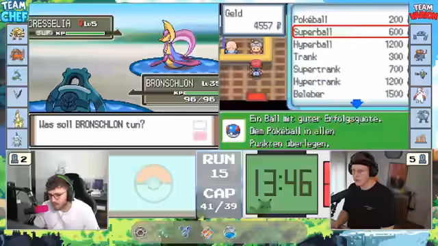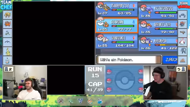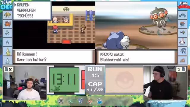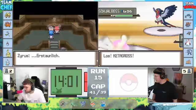 04:01:25Es wird eine Kooperation mit einem anderen Spieler gestartet, um gemeinsam Pokémon Platin zu spielen. Dabei wird die Strategie besprochen, mit welchem Pokémon angeführt werden soll, wobei Zillibi aufgrund seiner Egelsamen-Fähigkeit in Betracht gezogen wird. Es wird entschieden, dass Zillibi anführt, und der Streamer betritt den Kampf. Der Gegner setzt Gesang ein, was zu Problemen führt, aber der Streamer hat bereits Egelsamen eingesetzt. Es wird überlegt, welche Pokémon der Gegner haben könnte, darunter Dialga, Seedraking/Seemon und Garados. Der Streamer räumt ein, einen Fehler mit einem Supertrank gemacht zu haben. Es wird überlegt, wie man gegen den Gegner vorgehen soll, wobei Magpie ausgewechselt und Quappo mit Surfer eingesetzt werden soll. Der Gegner setzt Flammenwurf ein, aber ohne großen Schaden anzurichten. Es wird festgestellt, dass der Gegner Konfu-Strahl einsetzt, was zu weiteren Überlegungen führt.