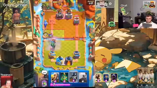 09:07:30Es wird über ein TikTok-Video von BigSpin mit einer Fünf-Kronen-Chest berichtet, das auf dem FuturePlay-Account gefunden wurde. Es wird kurz über Max' Urlaub gesprochen und wie er absichtlich getriggert wird, indem ihm Screenshots von Grand Challenge-Niederlagen geschickt werden. Der Streamer erklärt, dass er Max neckt, weil dieser ihn zuvor auch immer wieder mit seinen Misserfolgen aufgezogen hat. Es wird eine Spielsituation analysiert, in der überlegt wird, wo ein Golem am besten platziert werden sollte, wobei verschiedene strategische Überlegungen einfließen. Es wird überlegt, wie man Golem am besten einsetzt, um die Brücke zu sichern und den Gegner unter Druck zu setzen. Der Streamer erklärt, dass er Max neckt, weil dieser ihn zuvor auch immer wieder mit seinen Misserfolgen aufgezogen hat, und dass er dies als Retourkutsche betrachtet. Es wird überlegt, wie man Golem am besten einsetzt, um die Brücke zu sichern und den Gegner unter Druck zu setzen.
