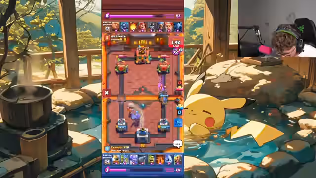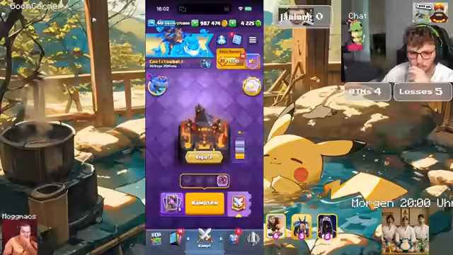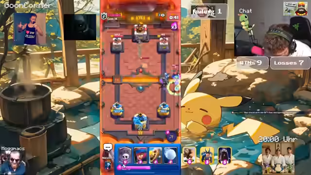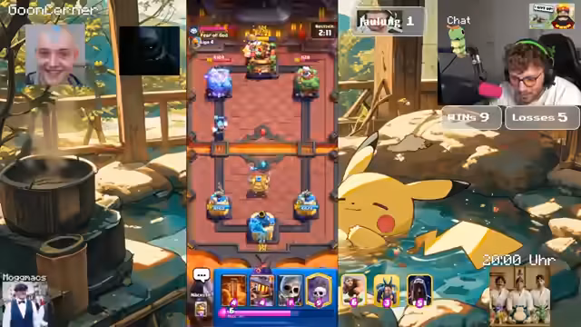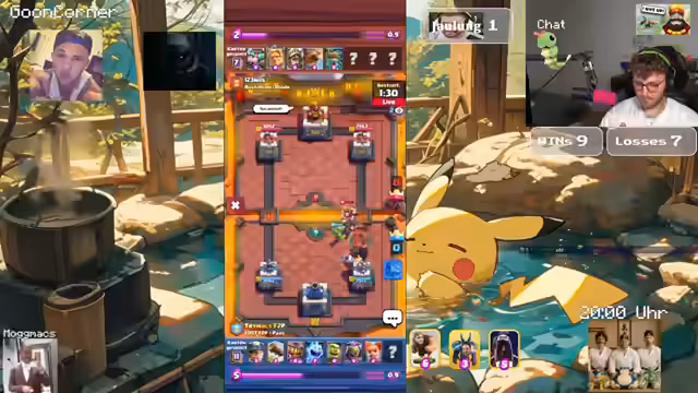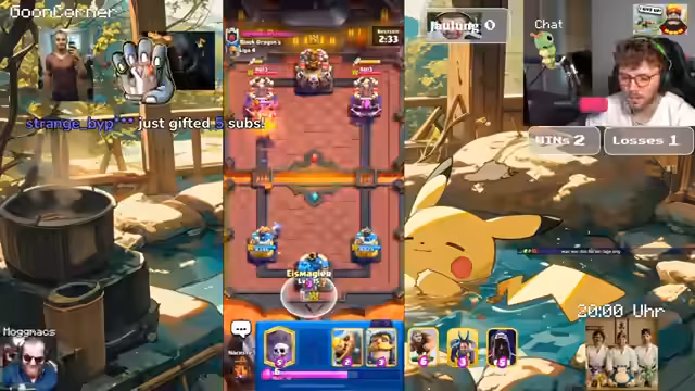 04:08:33Das Stream-Team trifft auf einen Gegner mit einem Damage-Lead-Deck, was das Spiel zäh und spannend macht. Nach einigen Fehlern und einem Knockback auf die eigene Kanone droht die Niederlage. Dennoch gelingt ein beeindruckendes Comeback durch den Einsatz einer Triple-Cannon-Kombination, die letztlich den sicheren Sieg einbringt, obwohl der Gegner keine offensiven Zauber mehr besitzt.