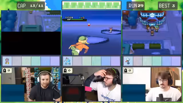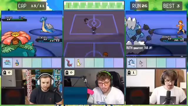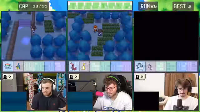 06:09:59Der Fokus liegt auf dem Gameplay. Es gibt einen sehr knappen Kampf, in dem Romata gegen ein Pokémon nur mit wenigen HP überlebt, was große Nerven kostet. Anschließend wird das Fangen eines Pokémon mit einer sehr schlechten Catch-Rate diskutiert. Die Streamer kämpfen darum, ihre Pokémon am Leben zu halten und müssen strategische Entscheidungen treffen, um den Run nicht zu gefährden.