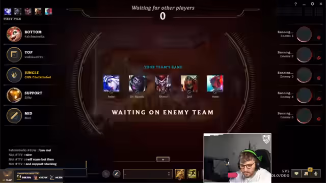 06:27:23Streamer analysiert das gegnerische Draft mit den Picks Lux, Kasapaya und Anivia gegen die Caitlyn und Sylas. Er äußert Verwirrung über den Lux-Engel als Mid-Lane-Pick und kritisiert das angeblich tote Match-Up. Bei den eigenen Picks äußert er Bedenken gegen Vladimirs Spätspiel-Stärke und der Kassadin als starke Option. Für die Community-Partie betont er, dass er Tryhards vermeiden und für Spaß sorgen will, und prüft aktiv die Ränge der Mitspieler, um ein faires Spiel zu gewährleisten.