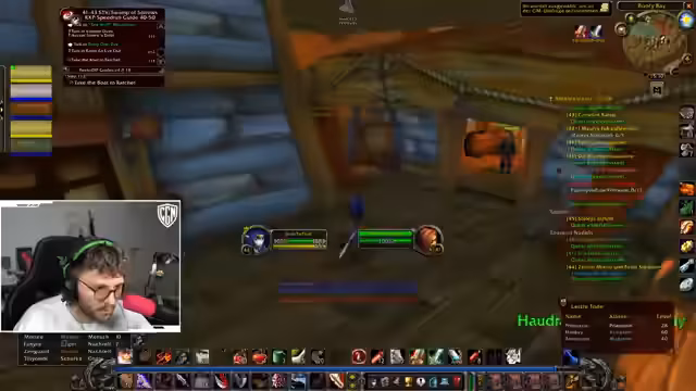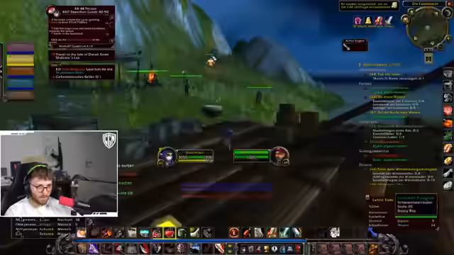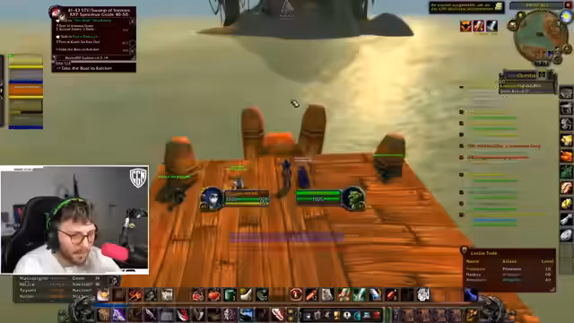 00:33:10Die Gruppe ist komplett und beginnt die Schiffs-Quests in Booty Bay. Die genauen Quests, wie die Tötung der Anführer auf den Schiffen und das Sammeln von Plänen und Tabak, werden im Detail besprochen. Der Streamer gibt strategische Hinweise, wie man die Mobs pullt, um nicht die gesamte Schiffsbesatzung anzuziehen, und verteilt Rollen, wie Tank und Heiler, um den Kampf effizient zu gestalten.