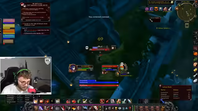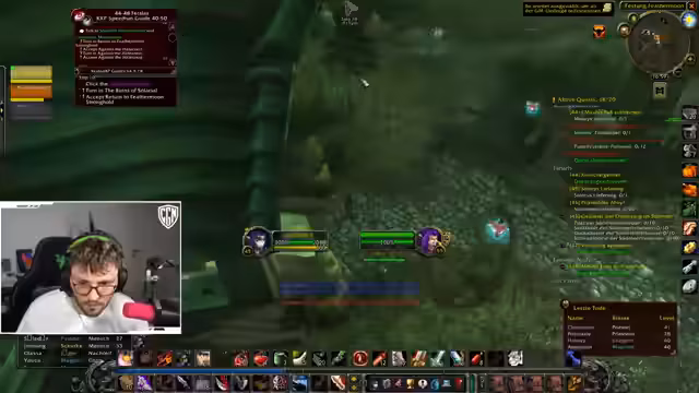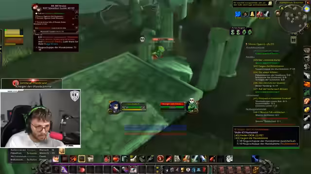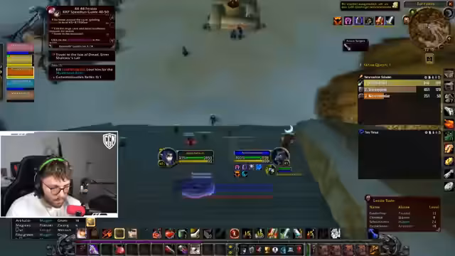 02:17:06Die Gruppe arbeitet an der Fertigstellung der Quest 'Flut der Gezeiten'. Dazu müssen Murlocs getötet und ein Messer in einen Altar gesteckt werden. Es wird koordiniert, wer welche Aufgabe übernimmt. Nach Abschluss der Quest wird eine kurze Pause eingelegt, um sich auf die nächste Aufgabe vorzubereiten, bevor es in eine Höhle mit Elite-Ogres geht.