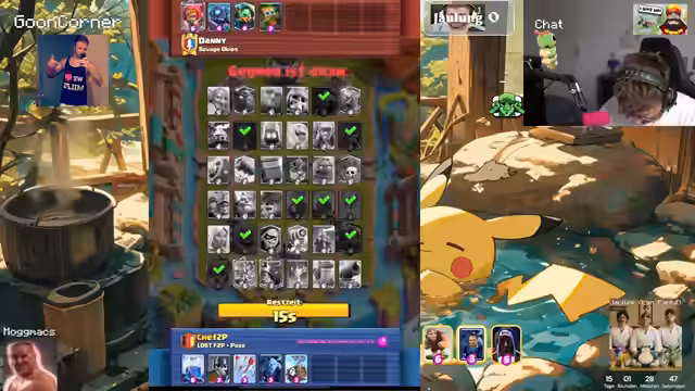 League of Legends mit Riven wird von Frust und Selbstkritik begleitet. In Clash Royale folgen Vorbereitungen für das Match gegen BigSpin, mit Deckauswahl und Draft-Analysen. Es folgen Diskussionen über spielerische Fähigkeiten im Alter, Umgang mit Kritik und persönliche Beziehungen zu anderen Streamern.
