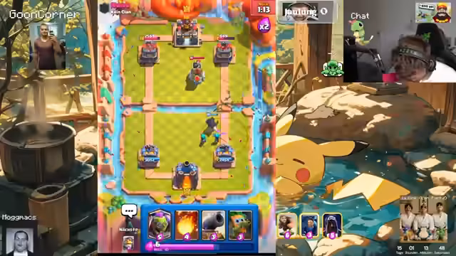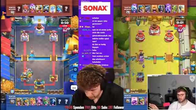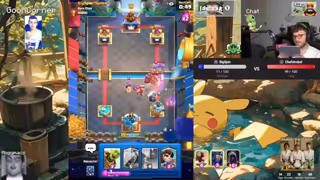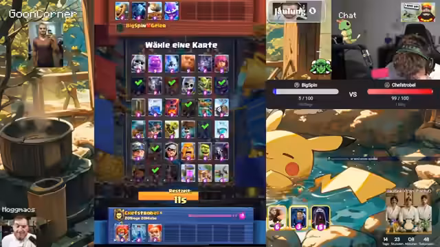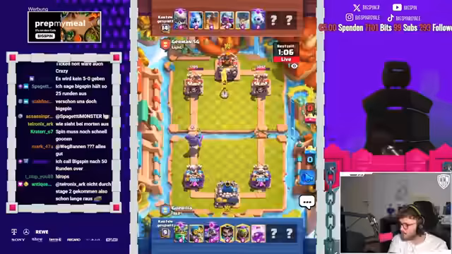 02:56:46Das Clash Royale-Turnier gegen Big Spin geht weiter mit mehreren intensiven Matches. Der Streamer arbeitet eng mit seinem Team zusammen, koordiniert seine Züge und reagiert auf die Entwicklungen im Spiel. Er zeigt sowohl technische Fähigkeiten als auch strategisches Denken. Es kommt zu Spannungsmomenten und besonderen Spielzügen, die der Streamer live kommentiert. Die Stimmung ist von Konzentration und Wettkampfesgeprägt, mit Momenten der Freude bei Erfolgen.