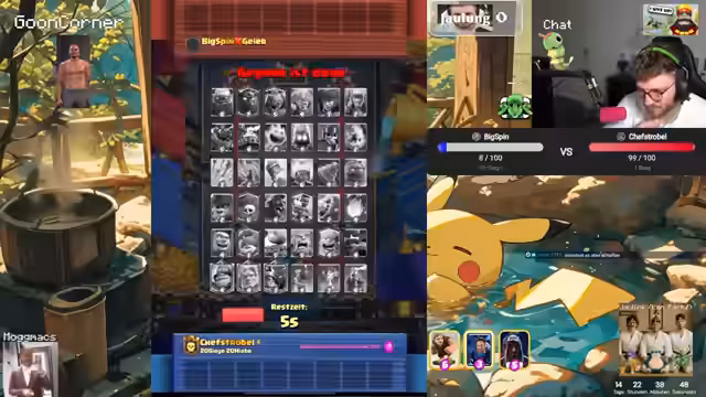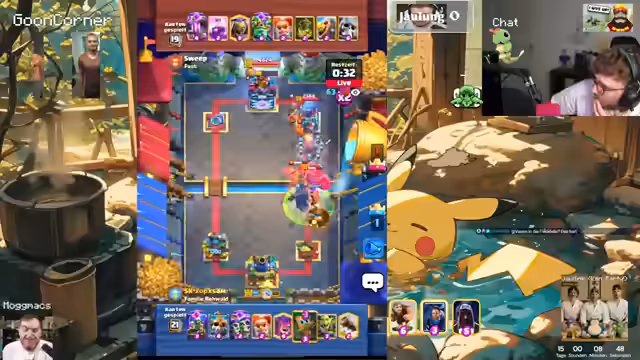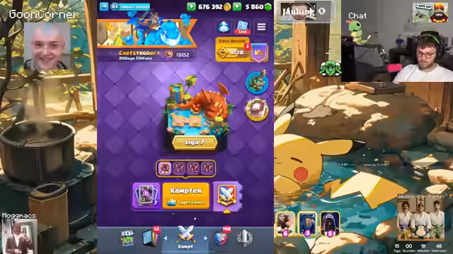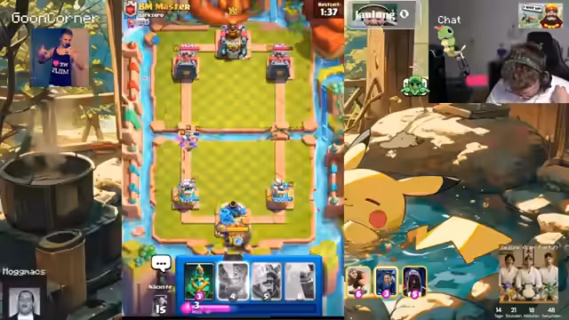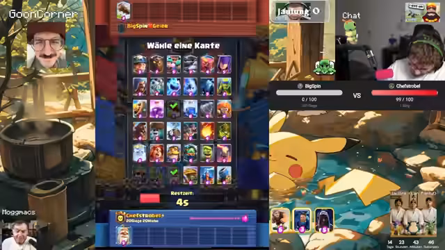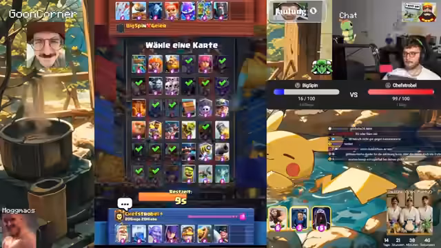 02:20:16Es beginnt die Vorbereitung auf das 99-gegen-1 Match in Clash Royale. Es werden verschiedene Karten und Decks ausprobiert, wobei der Streamer sich über seine eigenen Fehlentscheidungen ärgert. Es wird überlegt, welche Karten gegen bestimmte Gegner am effektivsten sind. Der Streamer hadert mit seiner Deckauswahl und kritisiert seine eigenen Picks. Es wird überlegt, ob man auf Golem oder Royal Giant setzen soll. Der Streamer drückt versehentlich die Schweine-Karte und ärgert sich darüber, weil er keine Wing Condition hat. Es wird überlegt, wie man das Spiel noch gewinnen kann, obwohl man eine schlechte Deckauswahl getroffen hat. Der Streamer bedankt sich für einen Golem und äußert sich begeistert über sein Deck. Es wird überlegt, ob man noch einen weiteren Spell nehmen soll. Der Streamer ärgert sich über einen Gegner, der ein billiges Deck spielt. Es wird überlegt, ob man E-Giant nehmen soll, weil alles, was ihn toucht, kaputt gemacht wird. Der Streamer kritisiert die Picks eines anderen Spielers und bezeichnet sie als Müll. Es wird ein Turm verloren und der Durchfall-Curs befürchtet. Der Streamer ist überrascht über die Picks eines Gegners und vergleicht ihn mit Danny aus Savage Oakies. Es wird die Stärke von Goblin Machine gelobt und die eigene Entscheidung kritisiert. Der Rage eines Gegners wird als stark empfunden. Es wird überlegt, ob man Golem oder Royal Dynes spielen soll. Es wird die Langeweile von IG kritisiert und der Wunsch geäußert, es spannend zu machen. Der Streamer ärgert sich darüber, dass er zu weit hinten gespawnt ist.
