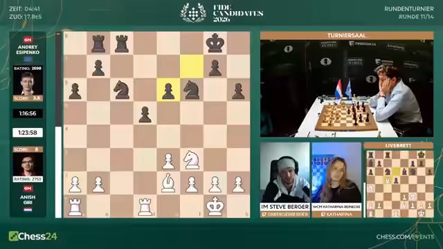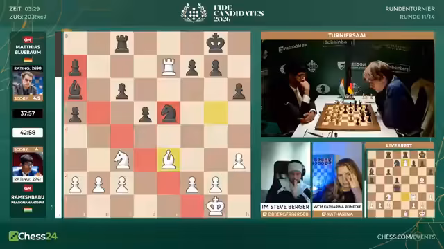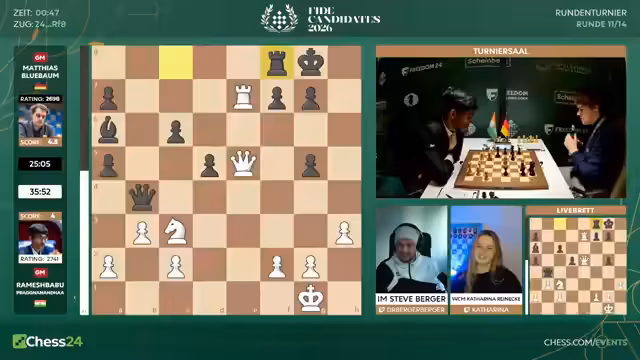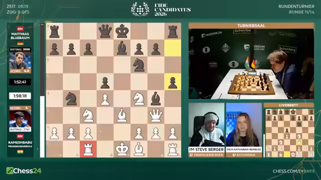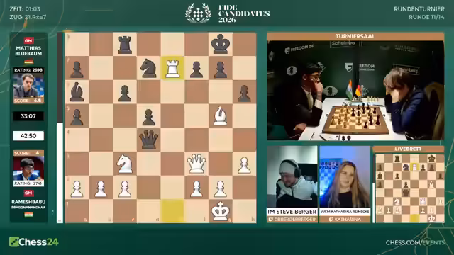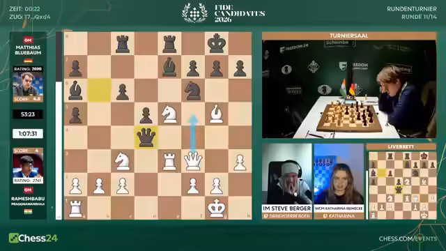 00:13:06Der Kommentator geht auf die Paarungen der elften Runde ein. Matthias Blübaum hat mit den schwarzen Steinen gegen den angeschlagenen Praggnanandha eine spannende Partie vor sich. Bei den Frauen ist das Feld extrem dicht, was für hohe Spannung sorgt. Die Kommentatoren diskutieren die Turnierverlaufstabelle und die mathematischen Chancen. Für Matthias Blübaum bleibt theoretisch eine Chance, aber sie wird als sehr gering eingestuft, insbesondere mit Blick auf die starken Konkurrenten.