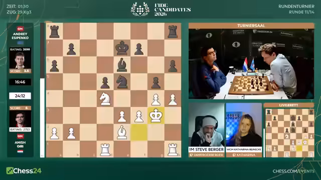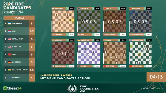 04:24:15Nach der Partie von Matthias bietet Prag Remis an, was angenommen wird. Die Kommentatoren wenden sich den anderen Partien zu und berichten, dass auch Giri gegen Easy Penko Remis gespielt hat. Das wichtigste Ergebnis kommt von Weishadi, die gewinnt und damit ihre Führung im Damenfeld aufrechterhält. Die Favorinnen Vaischali, Sujina und Anna Musischuk haben sich nun abgesetzt.