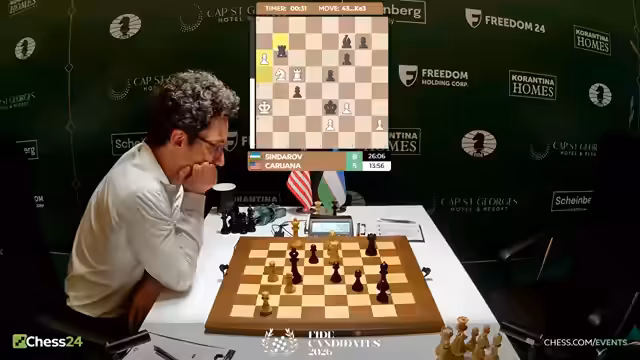 03:31:09In einem abschließenden Blick auf ein anderes wichtiges Duell wird ein Turmendspiel zwischen Fabian und Sindaroff analysiert. Fabian steht in einem Turm-gegen-Turm-Endspiel mit einem Mehrbauern, der jedoch als unmittelbar nicht gefährlich eingestuft wird. Kommentatoren diskutieren die Koordinationsmöglichkeiten und die strategischen Pläne beider Seiten, wobei Sindaroff durch Zugwiederholung ein Remis anstrebt. Fabian versucht, durch gezielte Züge wie König schlägt C4 und Springer D5 Druck aufzubauen und Mehrbauer zu realisieren.