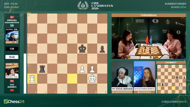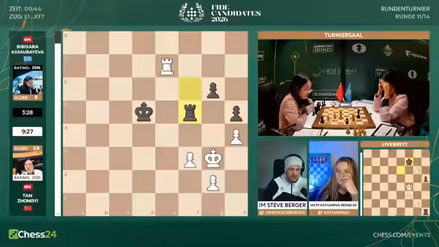 06:00:23Es wird eine tiefgehende Analyse von Bibisara Koskembajewas Verteidigung gegen Tan Zhongyi gegeben. Es wird erklärt, wie sie in einem Endspiel mit zwei Bauern gegen einen Turm durch das exakte Verziehen des Turms auf der dritten Reihe die Oberhand behielt und ihren König effektiv schützte. Ihre Entscheidung, nicht auf G4 zu ziehen, war entscheidend, da sie sonst in eine verlorene Position geraten wäre. Trotz dieses glimpflichen Remis verpasst Koskembajewa den Anschluss an die Spitzengruppe und liegt nach der Runde anderthalb Punkte hinter der Führenden, Charlie Liu. Ihr Weiterkommen wird als schwierig, aber nicht unmöglich, bewertet.