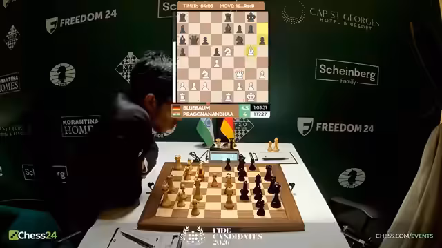 00:26:16Das Kommentatoren-Team analysiert die Eröffnungswahlen. Blübaum treu bleiben seinem Springer-D3-Repertoire, während Praggnanandha wahrscheinlich eine D4-Eröffnung wählen wird. Die Diskussion konzentriert sich auf die strategischen Pläne und die Vorbereitung beider Spieler. Der Kommentator vermutet, dass Blübaum mit Schwarz solid spielen wird und Chancen nur dann entstehen, wenn Praggnanandha eine ungewöhnliche und wilde Eröffnung wählt. Stellungsmäßig scheint die Partie ausgeglichen zu sein, mit einer symmetrischen Bauernstruktur.
