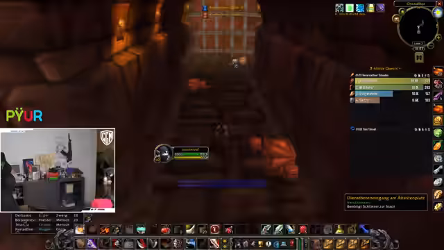 07:20:55Die Gruppe startet einen weiteren Durchgang in einem Dungeon. Es wird über die Notwendigkeit eines Rouges in einem bestimmten Dungeon gesprochen, um einen gefährlichen 'Dau-Sing'-Effekt zu kontrollieren. Während des laufenden Dungeons wird über diverse Loot-Möglichkeiten gesprochen und das Team muss kritische Situationen meistern, in denen ein Spieler fast stirbt und andere nicht sofort eingreifen können können. Die Stimmung ist angespannt, wird aber durch humorvolle Bemerkungen und den Ruf an 'Juli, Juli, Juli' aufgelockert.