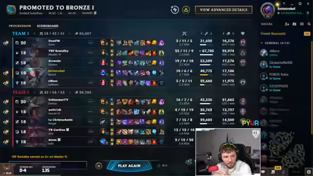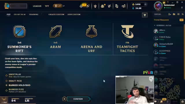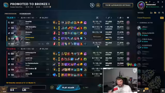 08:30:17Der Streamer wechselt das Thema zu League of Legends und berichtet über eine verheerende Abwärtsspirale auf seinem Smurf-Account von Silber 1 bis niedriges Platin. Trotz eines brandneuen Buffs für die Figur 'Brand' ist er frustriert über das Matchmaking, das ihn bei Verlusten stärkere Gegner zuweist. Er diskutiert mit seinem Mitspieler 'Max' über die Rollenwahl und plant, beide in der Bot-Lane zu positionieren, um gemeinsam Gold zu farmen und eine Turbo-CC-Kombo zu ermöglichen.