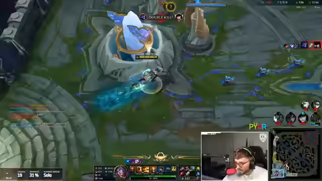 11:24:45Der Streamer testet die Kombination Pantheon Support und Vel'Kos ADC in einem Normal Game. Er erklärt das Spielprinzip: Pantheon's Schild blockt Schaden während sein Stun Vel'Kos' Skillshots ermöglicht. Das Game gestaltet sich jedoch chaotisch, mit einer hohen Fehlerquote und mangelnder Koordination, was dem Streamer die Komplexität des neuen Duos vor Augen führt.