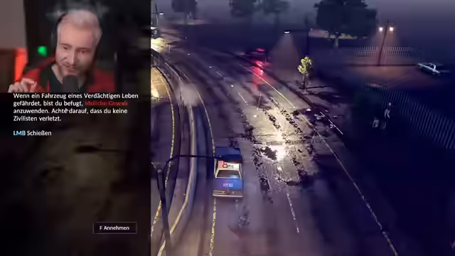 03:10:01Nachdem der Streamer eine Hubschraubersteuerung gemeistert hat, fliegt er über Avena City und entdeckt ein verdächtiges Fahrzeug. Nach anfänglichen Schwierigkeiten bei der Steuerung gelingt es ihm, das Fahrzeug zu markieren und Unterstützung anzufordern. Eine aufregende Verfolgungsjagd beginnt, bei der der Streamer das Fahrzeug zur Aufgabe zwingt und den Fahrer festnehmen kann.