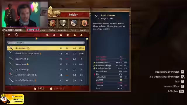 01:10:22Es werden Beinlinge mit Strumpfbändern gefunden, die Charisma geben. Der Streamer überlegt, ob er die Sachen zusammenklauen soll. Es wird festgestellt, dass einige Gegenstände nicht angezogen werden können, da es sich um Frauensachen handelt. Nach einem kurzen Abstecher zu Twitch wird ein Schneiderladen entdeckt, in den eingebrochen wird. Der Laden scheint leer zu sein, und der Streamer kann sich günstig mit Ausrüstung eindecken. Es werden verschiedene Gegenstände wie Huthüte und Scheren entdeckt und mitgenommen. Der Streamer achtet darauf, nicht entdeckt zu werden. Es werden verschiedene Kleidungsstücke mitgenommen, um das Charisma-Outfit zu verbessern. Der Fokus liegt auf Gegenständen, die über 100 Groschen wert sind. Der Streamer ist nun überladen und muss überlegen, wie er die Beute transportieren kann. Er erinnert sich daran, seinen alten Handyvertrag gekündigt zu haben und ist stolz darauf. Die geklauten Sachen müssen in eine Kiste geräumt werden, bevor sie angezogen werden können, um nicht erwischt zu werden.