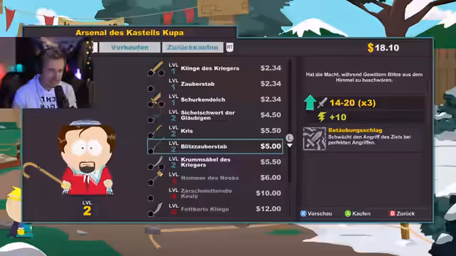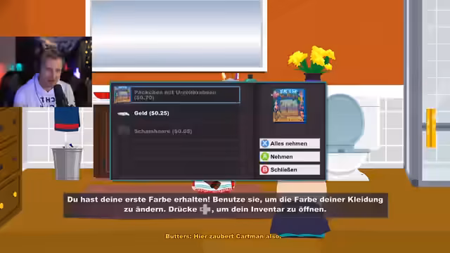 00:41:49Nach mehreren technischen Pannen, die durch Windows-Updates verursacht wurden, und nach einem Neustart des Spiels beginnt der Streamer mit der Charaktererstellung. Er erstellt seinen Charakter, 'Saftsack', wählt die Klasse 'Jude' und rüstet ihn mit einem Judenstab und heiliger Robe aus. Er beschreibt den spielerischen Einstieg in die Welt von South Park, die Erkenntnis, im Spiel Single zu sein, und das erste Gefecht mit dem Charakter Clyde.