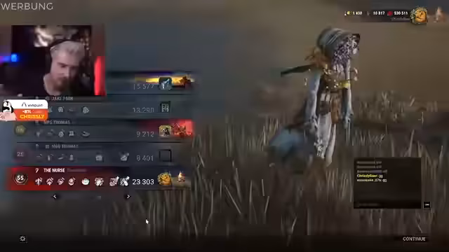 02:37:00Während einer Runde mit der Nurse wird eine Situation mit zwei Taschenlampen angesprochen. Der Streamer entscheidet sich dafür, Lightborn zu verwenden, um sich vor Blendungen zu schützen und die Situation unter Kontrolle zu bringen. Es werden die Vor- und Nachteile von diversen Perks analysiert, um eine effektive Loadout zu finden.