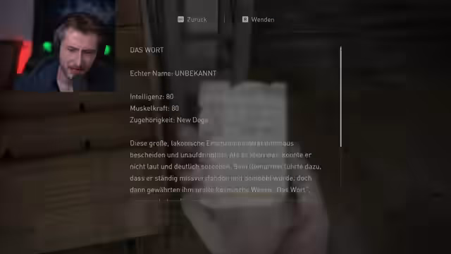 03:46:34Der Streamer setzt die gründliche Suche nach weiteren Gegenständen fort, auch aus Prinzip, da er das Gefühl hat, etwas übersehen zu haben. Er erhält einen Schlüssel, kann aber zunächst keine zugehörige Tür finden. Mit dem Schlüssel gelangt er schließlich in einen neuen Bereich, einen Musikladen, wo er WLF-Propaganda vorfindet. Eine Notiz darin offenbart die Existenz einer weiteren Fraktion namens 'New Dogs' und eines Charakters namens 'Das Wort', der mit einem Flüchen Menschen in Wahnsinn treiben kann.