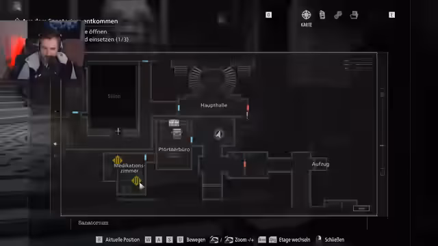01:44:12Nach der Rückkehr vom Kurzaufenthalt erkundet der Spieler nun den Westflügel des Sanatoriums. Er findet ein Patientenverzeichnis, das auf drei Schlüsselkarten für Verwaltung, Krankenstation und Ostflügel hindeutet. Entscheidend ist die Entdeckung eines Whiteboards, auf dem die Symbole Mond, Sonne und Stern erwähnt werden. Diese korrespondieren mit den Symbolen der leitenden Angestellten des Sanatoriums, was als Hinweis für ein bevorstehendes Rätsel dient, um in geschützte Bereiche vorzudringen.