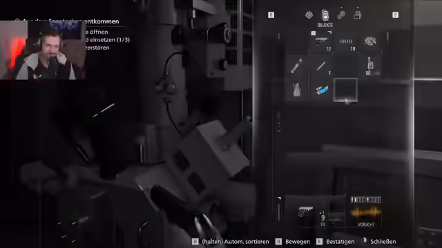 03:44:21Im Bereich der Garage findet der Streamer eine schwere Organtransportbox, die ihm nur einen Inventarplatz im Gürtel kostet. Er ist sich sicher, dass der Inhalt des Organs für den Fortschritt der Mission wichtig ist, ist sich aber noch unschlüssig, wohin es gebracht werden muss. Die schwere Box verlangsamt seine Beweglichkeit erheblich.