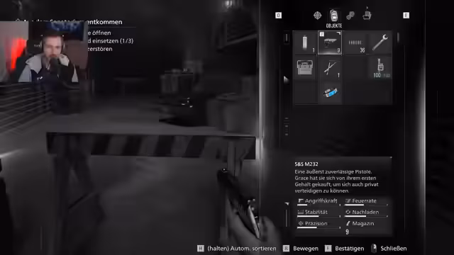 02:40:59Der Streamer findet eine neue, kompakte Dienstpistole aus dem Jahr 1977, die Grace sich von ihrem ersten Gehalt gekauft hat. Er gerät in eine schwierige Situation mit wenig Munition und entscheidet sich, das Behelfsmesser zu nutzen. Er räumt seinen Inventarplatz auf, indem er einige Gegenstände verstaut und stellt fest, dass Grace's Pistole im Schaden besser ist, als seine bisherige Waffe. Bei einem Kampf verliert er sein Messer fast, woraufhin er ein neues herstellen muss.