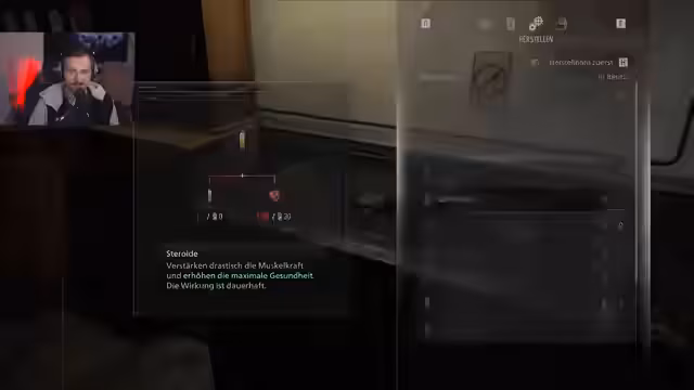02:44:00Der Streamer entdeckt das Blutentnahmegerät und das Lasermikroskop, die zum Kern des Forschungssystems gehören. Er sammelt infiziertes Blut, analysiert es im Lasermikroskop und unlockt dadurch neue Rezepturen zur Herstellung von Gegenständen. Er stellt fest, dass die Herstellung von Steroiden zur Steigerung der maximalen Gesundheit und von hochwertiger Munition aus Metallteilen und Blut möglich ist. Das Tutorial wird als sehr präsent empfunden, da viele Mechaniken erklärt werden.