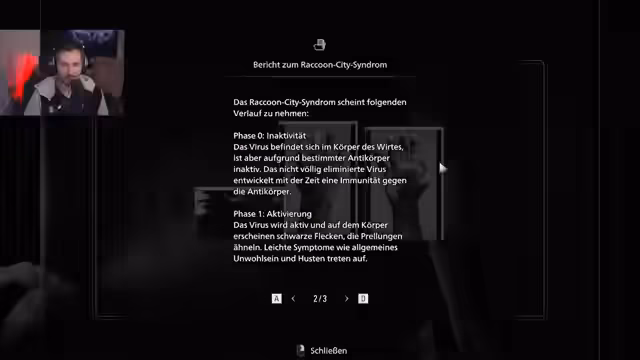 05:39:23Der Streamer stößt auf einen PC mit brisanten Informationen. Dort wird das spät manifestierende T-Virus-Syndrom, auch bekannt als Raccoon City-Syndrom, detailliert beschrieben. Das Dokument schildert die vier Phasen der Infektion, von der anfänglichen Inaktivität über die Aktivierung und Entwicklung bis hin zum letalen Endstadium, das innerhalb von ein bis zwei Stunden zum Tod führt. Anschließend liest er die letzten Aufzeichnungen eines Mitarbeiters, der von einem gescheiterten Experiment und dem Tod aller Kollegen berichtet.