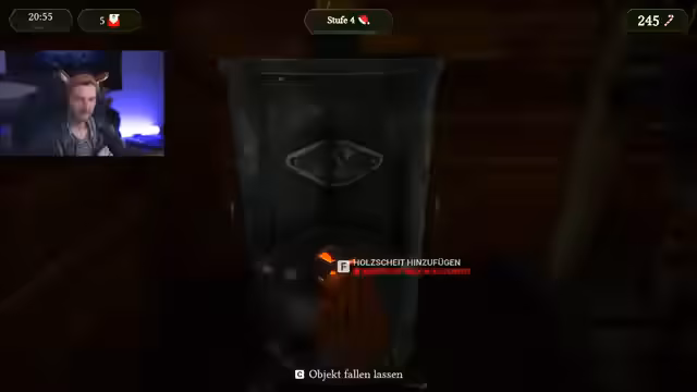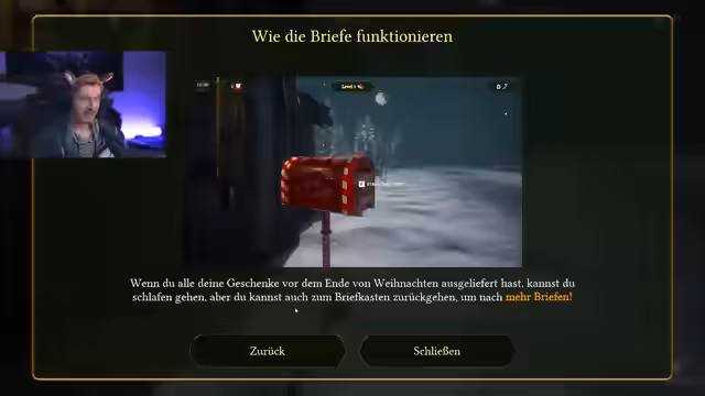 00:53:01Der Streamer spielt Santa Simulator und erklärt die Mechaniken: Der Weihnachtsmann muss Holz für den Kessel sammeln, um die Fabrik zu betreiben. Aus dem Briefkasten sammelt er Briefe von Kindern, liest deren Wünsche und wählt passendes Spielzeug aus dem Förderband aus. Die Lieferung findet zwischen 16 und 5 Uhr statt, danach muss geschlafen werden.