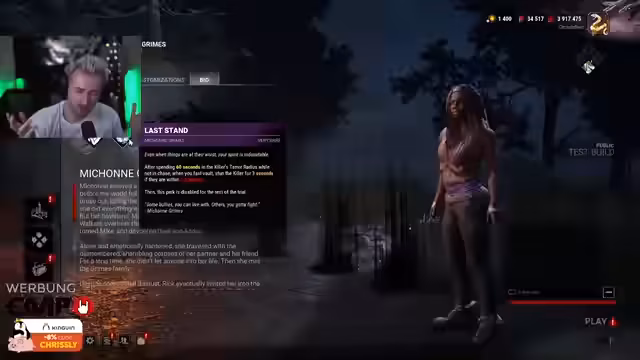 02:18:47Der Streamer befasst sich intensiv mit der neuen Inhalte der Public Test Build, insbesondere dem neu eingeführten Skin Daryl Dixon aus The Walking Dead. Er diskutiert die Kosten und beschreibt detailliert die verschiedenen Perks, wie Dance with me und Deception, die laut Patch Notes verstärkt wurden und nun fünf Sekunden anhalten statt drei. Auch die visuellen Details des Skins, wie die Haltung des Charakters, werden positiv bewertet und als gelungene Umsetzung des Originals bezeichnet.