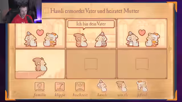 02:58:41Im Spiel 'Storyteller' wird die komplexe Handlung diskutiert, in der Hasli seinen Vater ermordet und seine Mutter heiratet. Es entstehen verwirrende Familienbeziehungen, wenn Mutter und Vater wechseln oder zusätzliche Charaktere wie Fürsli und Winsli hinzukommen. Der Streamer versucht, den Stammbaum zu rekonstruieren, während die Figuren sich gegenseitig ausheiraten und Konflikte entstehen. Dabei wird deutlich, dass die Logik der Geschichte oft lückenhaft ist und die Beziehungen zunehmend unübersichtlich werden.