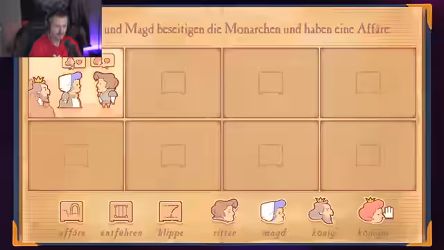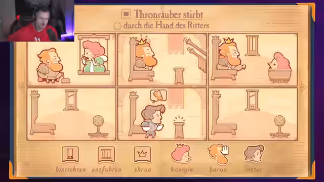 02:13:20Nach mehrfachen Versuchen und Anpassungen gelingt es, die Thronintrige zu lösen. Die Königin wird befreit, die Krone zurückgeholt und der Baron hingerichtet. Daraufhin startet der Streamer die nächsten Kapitel des Spiels. In Kapitel 7 geht es um Geheimnisse, Ertappt und Mord, während Kapitel 8 Gerechtigkeit und Thronräuber behandelt. Kapitel 9 dreht sich um Verrat und Hinrichtung, wobei ein Thronräuber stirbt.