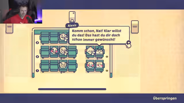 03:55:16Der Streamer startet das Spiel 'Is This Seat Taken?' und stellt erste Herausforderungen bei der Sitzplatzverteilung in einem Zugabteil. Verschiedene Charaktere äußern Präferenzen: Einige wollen am Fenster sitzen, andere lieber allein, wieder andere stören sich an lauter Musik oder schlechten Gerüchen. Der Streamer muss Lösungen finden, um alle zufriedenzustellen, und lernt die Spielmechanik kennen, bei der er Charaktere basierend auf ihren Wünschen platziert. Ein Charakter erwähnt sogar, dass er vergessen hat zu duschen.