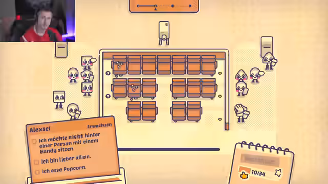 04:44:44Im letzten Levelabschnitt des Spiels geht es um Kinobesuche und Filmreferenzen. Charaktere äußern Wünsche wie nicht hinter jemandem mit Handy sitzen zu wollen, Popcorn zu stibitzen oder in bestimmten Reihen zu sitzen. Der Streamer bemerkt humorvolle Verweise auf Filmschauspieler wie Luca und diskutiert Handlungselemente, die er kennt. Trotz gelegentlicher Frustration über die Komplexität der Aufgaben schafft er es, die meisten Charaktere zufriedenzustellen, und bemerkt, dass das Spiel relativ einfach geworden ist.