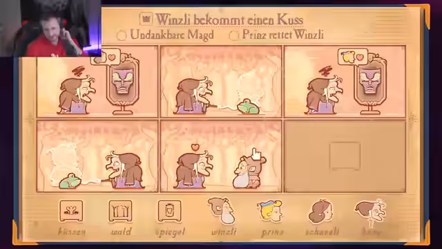 01:00:59Nach den langen Gesprächstiefen wechselt der Streamer zur ersten Spielsektion. Er startet 'Storyteller', ein Spiel bei dem es darum geht, ein leeres Buch mit fesselnden Geschichten zu füllen. Nach einigen technischen Anpassungen der Lautstärke und des Bildausschnitts beginnt er mit dem ersten Kapitel. Das Ziel des Spiels ist es, durch das Zusammenfügen von Symbolen Szenen zu schaffen, die eine bestimmte Geschichte erzählen und den Titel 'Geschichtenerzähler' zu verdienen.