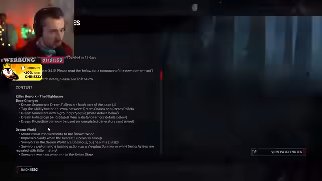 01:35:34Der Stream wechselt zu dem Spiel Dead by Daylight. Dabei kommt es zu technischen Problemen, da das Update für das Spiel nicht heruntergeladen wurde. Der Streamer startet Steam neu, während die Community ihm Ratschläge gibt. Es wird über das neue Update gesprochen, das einen Killer-Rework und neue Aufgaben mit sich bringt. Auch die neue Rift in den Archiven wird angesprochen, die neue Spielmechaniken und Belohnungen einführt.