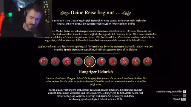 01:32:50Die spezifischen Schwierigkeiten des Hardcore-Modus werden im Detail vorgestellt. Der Streamer wählt mehrere negative Eigenschaften aus, die den Spielablauf dauerhaft erschweren, darunter 'Rückenprobleme', die die Tragekapazität reduzieren, und 'Schlafwandler', der das Einschlafen gefährlich macht. Weitere Beschränkungen sind ein langsamerer Erfahrungserwerb und schnellere Abnutzung von Schuhen. Diese Eigenschaften werden humorvoll mit realem Leben verglichen und als spiegelbildlich zur Persönlichkeit des Streamers beschrieben.