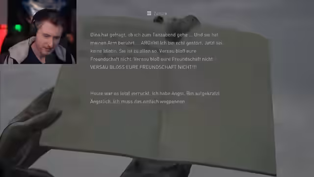 04:00:45Der Streamer interagiert mit Spielcharakteren wie Ellie und Dina und erzählt von ihrer Beziehung und ihrer gemeinsamen Reise. Er erwähnt Ellie Tagebucheinträge, die emotionale Momente zwischen den Charakteren zeigen. Er entdeckt auch Gegenstände wie eine Gasmaskenbong und eine Playstation 3, was die Welt des Spiels erweitert.