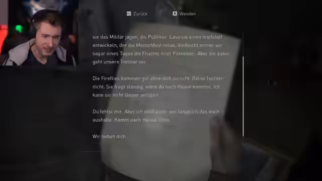 01:59:52Im Verlauf des Streams werden wichtige Story-Elemente des Spiels angesprochen, insbesondere die Immunität von Ellie gegenüber der Infektion und die damit verbundenen ethischen Fragen. Es werden Dialoge zwischen den Charakteren gezeigt und die Beziehung zwischen Joel und Ellie thematisiert, mit Spannungsbögen rund um ihre Mission und die Fireflies.