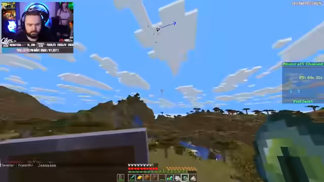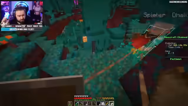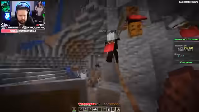 04:45:58Ein Spieler hat eine Schere gecraftet, um sich von der Kette zu befreien, was die Bewegungsfreiheit erhöht. Das Team muss improvisieren, um Hindernisse zu überwinden, wie z.B. das Bauen von Brücken oder das Abbauen von Blöcken. Die Kommunikation verbessert sich, da sie nun besser planen können. Es gibt jedoch weiterhin technische Probleme wie Rubberbanding, das die Bewegung beeinflusst.
