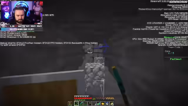 01:07:49Die Streamer entscheiden sich, in eine Mine abzusteigen, um weitere Ressourcen wie Eisen zu finden. Klüm plant, einen Leuchtturm zu bauen, während andere über den Bau von Schilden diskutieren. Sie stellen fest, dass sie mehr Holz benötigen und planen, dies zu besorgen. Die Gruppe bewegt sich tiefer in die Mine und findet verschiedene Ressourcen wie Eisen, Glowstone und Redstone, während sie gleichzeitig auf Creeper und Skelette achten müssen.