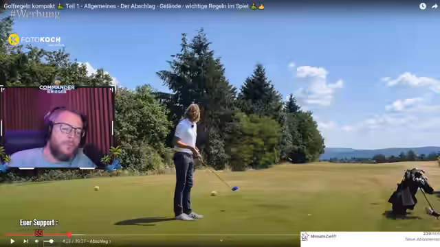 06:41:48Das zentrale Golfthema wechselt zum 'Gelände', also dem gesamten Platz außer Abschlag, Bunker und Grün. Die Grundregel lautet hier: Ball spielen, wie er liegt. Der Streamer klärt die Unterscheidung zwischen verbotenen Handlungen, die zu zwei Strafschlägen führen, und unglücklichen Umständen (Pech), die nur einen Strafschlag nach sich ziehen. Ein typisches Beispiel für Pech ist das versehentliche Bewegen des Balls ohne Absicht.