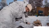 06:27:42Nachdem ein Standort für das Zelt auf dem zugefrorenen See gefunden wurde, beginnt der Aufbau des Camps. Das große Zelt wird aufgeblasen und der zentrale Ofen montiert, um für die notwendige Wärme zu sorgen. Parallel wird Feuerholz aus der Natur geschlagen und das Filtrieren von Schnee zu Trinkwasser sichergestellt, um die Überlebensgrundlagen für die eisige Nacht zu schaffen.