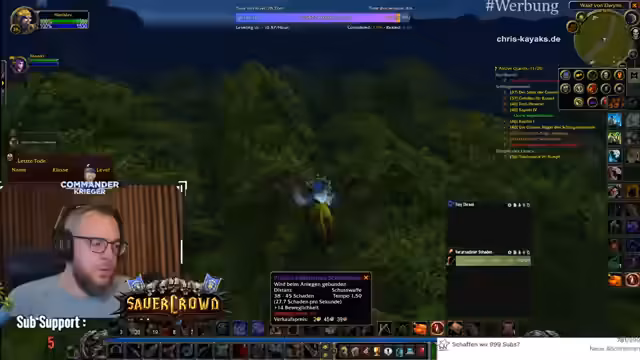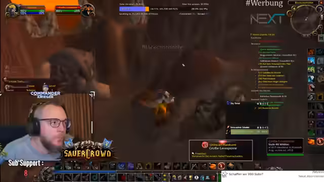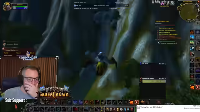 03:01:55Der Streamer erreicht Level 39, bleibt aber weiterhin in einer Zone (Desolace), in der er sich wohl nicht fühlt. Er diskutiert die Spielweise verschiedener Klassen und kommt zu dem Schluss, dass sein Jäger gut für das alleine Erkunden von Gebieten geeignet ist, ihn aber sehr vorsichtig macht, da er die Gefahr schlecht einschätzen kann. Er präsentiert als Beweis eine gefährliche Situation, in der er nur knapp dem Tod durch einen Gifteffekt entging, was seine Strategie des vorsichtigen Spielens unterstreicht.
