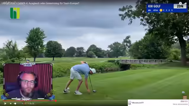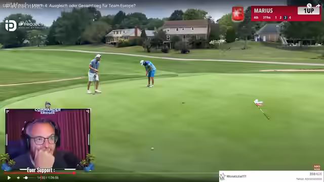 02:48:11Das Spiel ist ausgeglichen und es wird über die Ausrichtung des nächsten Lochs diskutiert. Ein Schlag landet im Bunker. Ein starker Schlag landet in der Nähe des Lochs, aber ein Chip wird als nicht optimal bewertet. Ein Putt geht links vorbei, was zu einem verlorenen Punkt führt. Ein weiterer Schlag landet zu kurz. Die Stärke des Gegners, auch unter Druck, wird hervorgehoben. Ein Schlag landet auf dem Grün. Ein starker Putt wird gespielt und geschenkt. Ein Loch wird mit drei Schlägen beendet, was zu einer Führung des Gegners führt. Ein Schlag landet im Baum. Ein Flop-Shot gelingt, und ein Putt wird gespielt. Ein Loch wird geteilt. Die Möglichkeit, vorzulegen oder über den Baum zu schlagen, wird diskutiert. Ein Schlag landet im Baum und die Entscheidung, wo gedroppt werden soll, wird überlegt. Es wird überlegt, ob man für Team Europe aufgeben soll, aber der Schlag wird ausgeführt. Ein guter Eisenschlag wird gespielt. Ein Mist-Patt wird bedauert. Ein Schlag landet auf dem Fairway und die Lücke wird positiv bewertet. Es wird überlegt, ob man mit einem Eisen oder Hybriden schlagen soll. Ein Schlag landet in der Nähe des Grüns. Ein Flop-Shot wird gespielt und ein Putt wird versenkt. Es wird überlegt, ob es vorbei ist oder nicht. Ein schlechter Schlag wird gespielt. Ein guter Schlag wird gespielt. Ein Chip wird auf das andere Grün gespielt, aber der Ball läuft weg. Ein Putt wird zum Paar versenkt. Ein Schlag landet im Baum und ein provisorischer Ball wird gespielt. Ein starker Schlag wird gespielt. Ein kurzer Schlag wird gespielt. Ein Chip-In wird versucht, aber der Ball geht nicht rein. Ein guter Putt wird gespielt. Ein starker Schlag wird gespielt und der Gegner gratuliert.