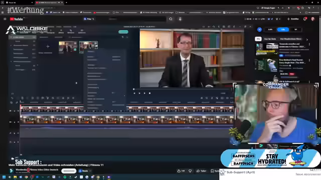 00:09:14Ein erheblicher Teil des Streams widmet sich der technischen Bearbeitung von mit zwei Kameras aufgenommenen Videos. Der Streamer beschreibt detailliert den Prozess, wie man mit der Software Wondershare Filmora Videospuren anhand von synchronen Geräuschen, wie einem Handeklatschen, in Einklang bringt. Er geht auf das Trennen von Audio und Video, das Synchronisieren durch markieren und schneiden sowie das Erstellen von Gruppen für eine einfache Bearbeitung ein.